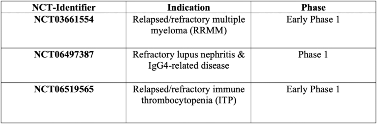 - Modality: Off-the-shelf donor-derived CAR-NK targeting BCMA.